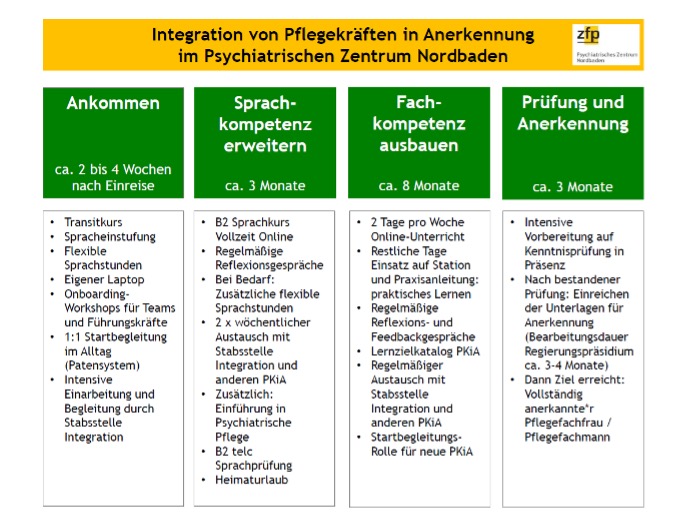 Das Integrationsteam im Psychiatrischen Zentrum Nordbaden unterstützt Pflegekräfte während des gesamten Anerkennungsprozesses – von der Bewerbung bis hin zur vollständigen Anerkennung als Pflegekraft.